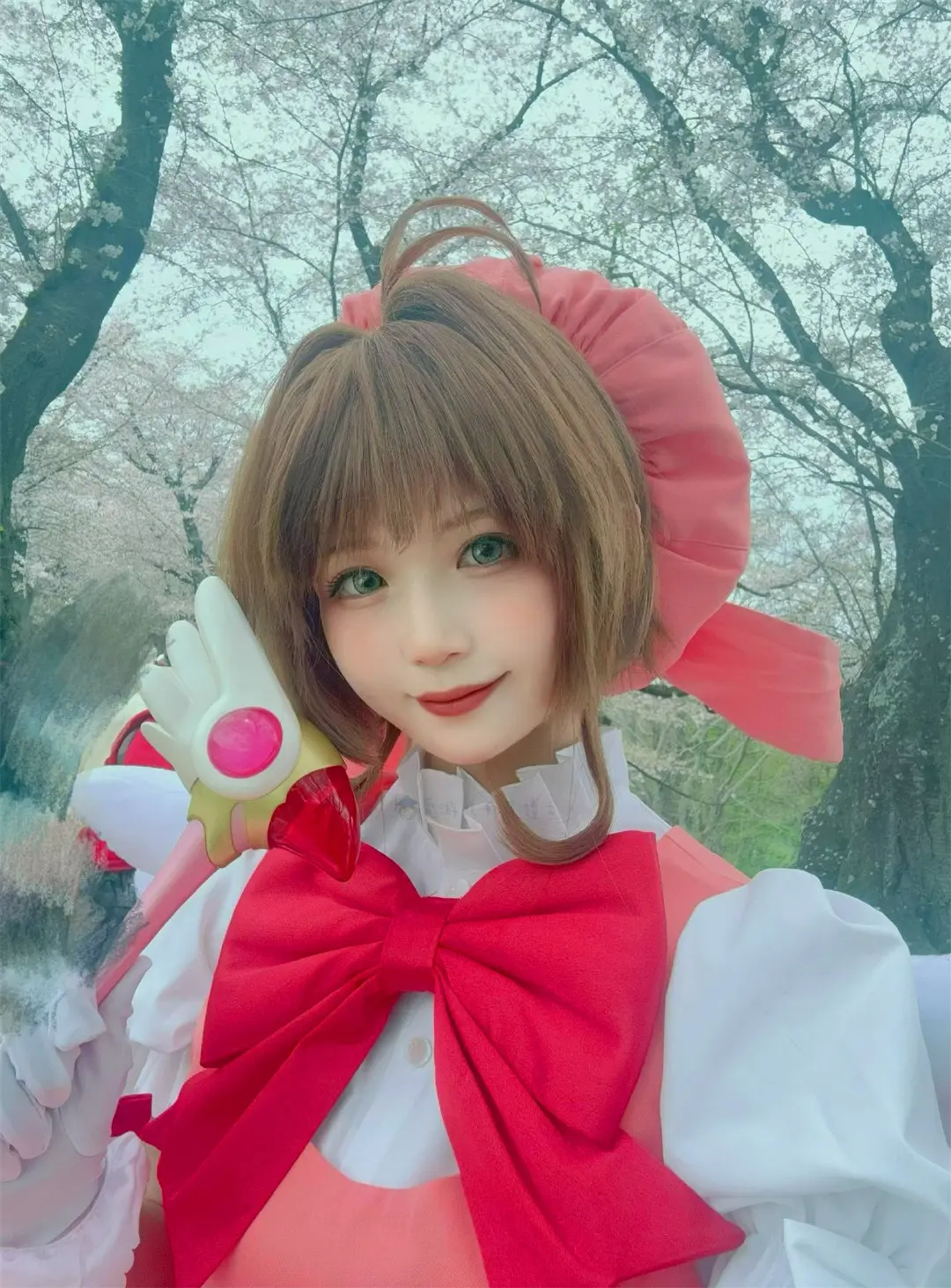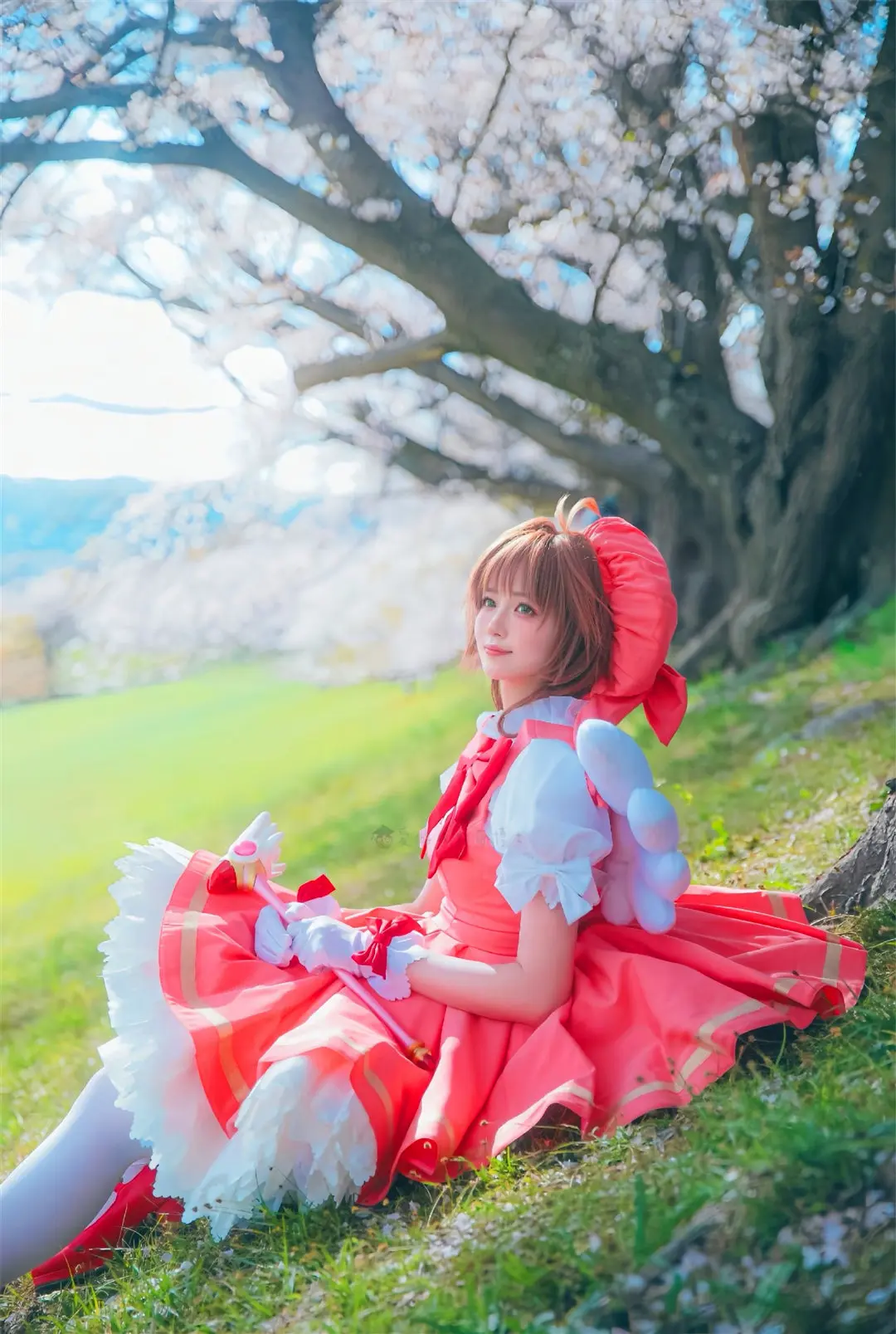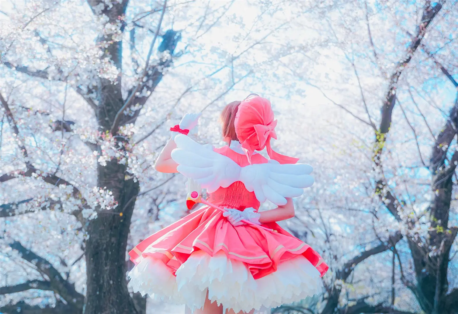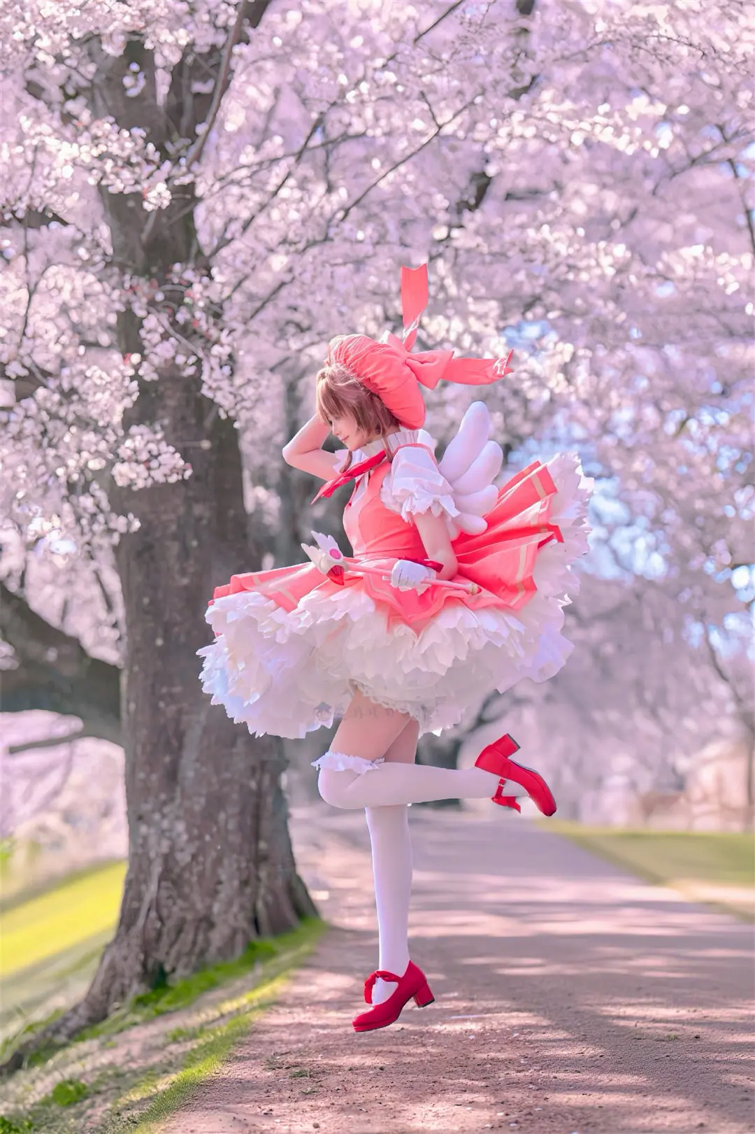 一提到与樱花相关的动漫人物,许多人和博士一样,第一反应就是木之本樱。一花一角色有着一种奇特的融洽感,“yukie”的选角非常棒。然后,扮相一模一样,轻盈蓬松的棕色短发下,那双灵动的墨绿色眼眸与小樱的天真与坚定完美交融;白色翅膀与红色蓬裙造型娇俏可爱,无论是守护甜心般的温暖微笑,还是其他的动人姿势,都惹人爱怜。
